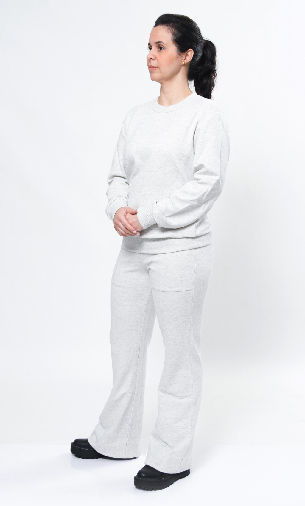 Blusa básica decote careca com punho aplicado no decote, mangas e barra. Calça flare com bolsos aplicados e recorte frontal pespontado. Confeccionado em moletinho fleece.